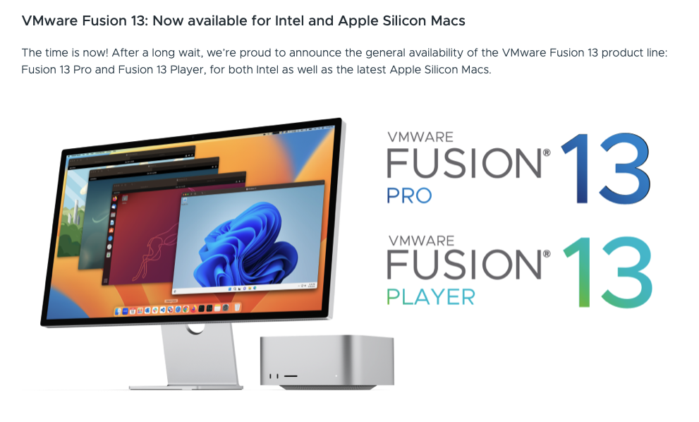 VMware ได้เปิดตัวเวอร์ชัน Fusion 13 ที่รองรับ Mac รุ่นชิป Apple Silicon แบบเต็มรูปแบบ ทำให้ผู้ใช้ Mac รุ่นชิป Apple Silicon (ชิป M1, M2) สามารถใช้ VMware เพื่อติดตั้ง Windows 11 ได้ (Arm)