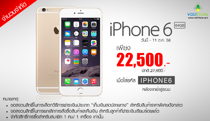 VoltZtore ร้านค้าออนไลน์ในเครือ BJC ได้ประกาศลดราคา iPhone 6 รุ่น 64GB (สีทอง) จาก 27,900 บาท เหลือ 22,500 บาท ตั้งแต่วันนี้ – 11 ตุลาคม 2558 (จำกัด 1 คน/เครื่อง) โดยสินค้ามีจำนวนจำกัด เมื่อใส่รหัส IPHONE6