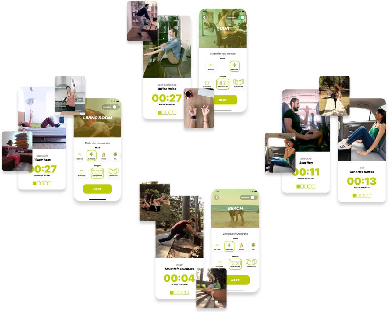 Wakeout! มีแบบฝึกการเคลื่อนไหวมากกว่า 1,000 รูปแบบ เหมาะสำหรับฝึกเคลื่อนไหวออกกำลังกายในสถานที่ต่างๆ มากมาย ไม่ว่าจะเป็นออฟฟิศ ที่ทำงาน ที่บ้าน บนรถ หรือที่โล่งอย่างสวนสาธารณะ มีทั้งรูปแบบการนั่งและยืน