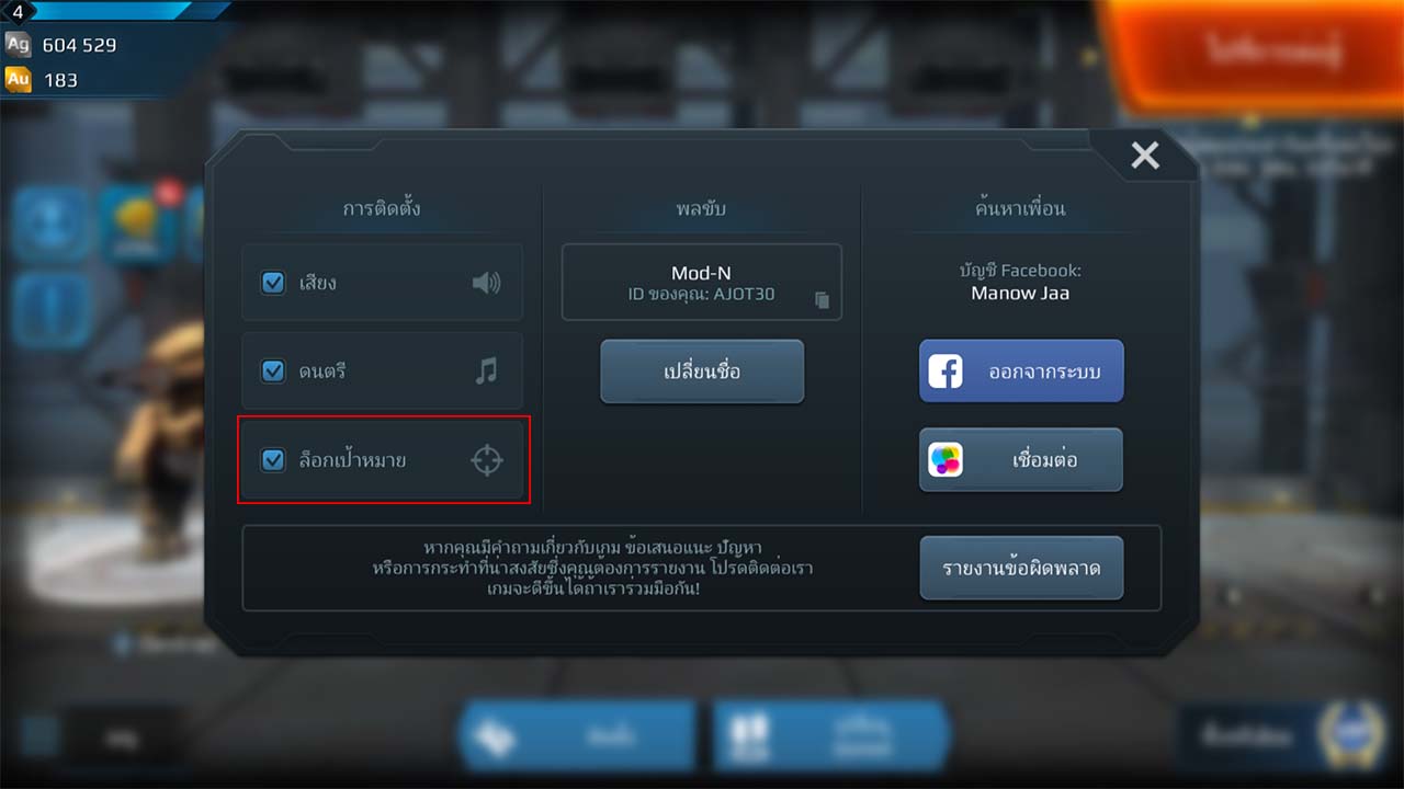 สามารถตั้งค่าศูนย์เล็งเพื่อให้ล็อกเป้าหมายอัตโนมัติได้จากเมนูตั้งค่า ติ๊กถูกตรงช่อง “ล็อกเป้าหมาย” กรอบสีแดง ดังรูปด้านล่างนี้