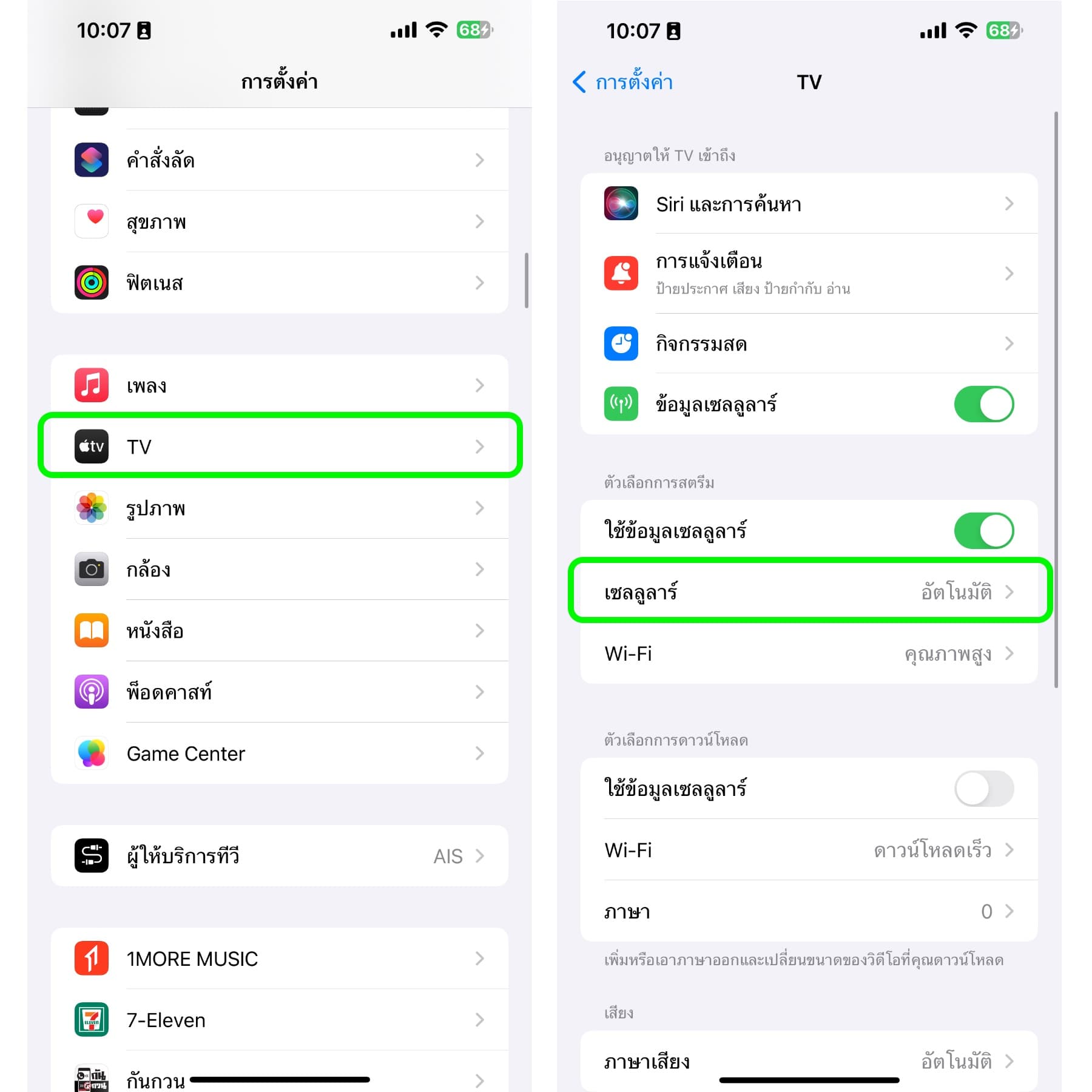 แอปการตั้งค่า > Apple TV > เปิด “ใช้ข้อมูลเซลลูลาร์”