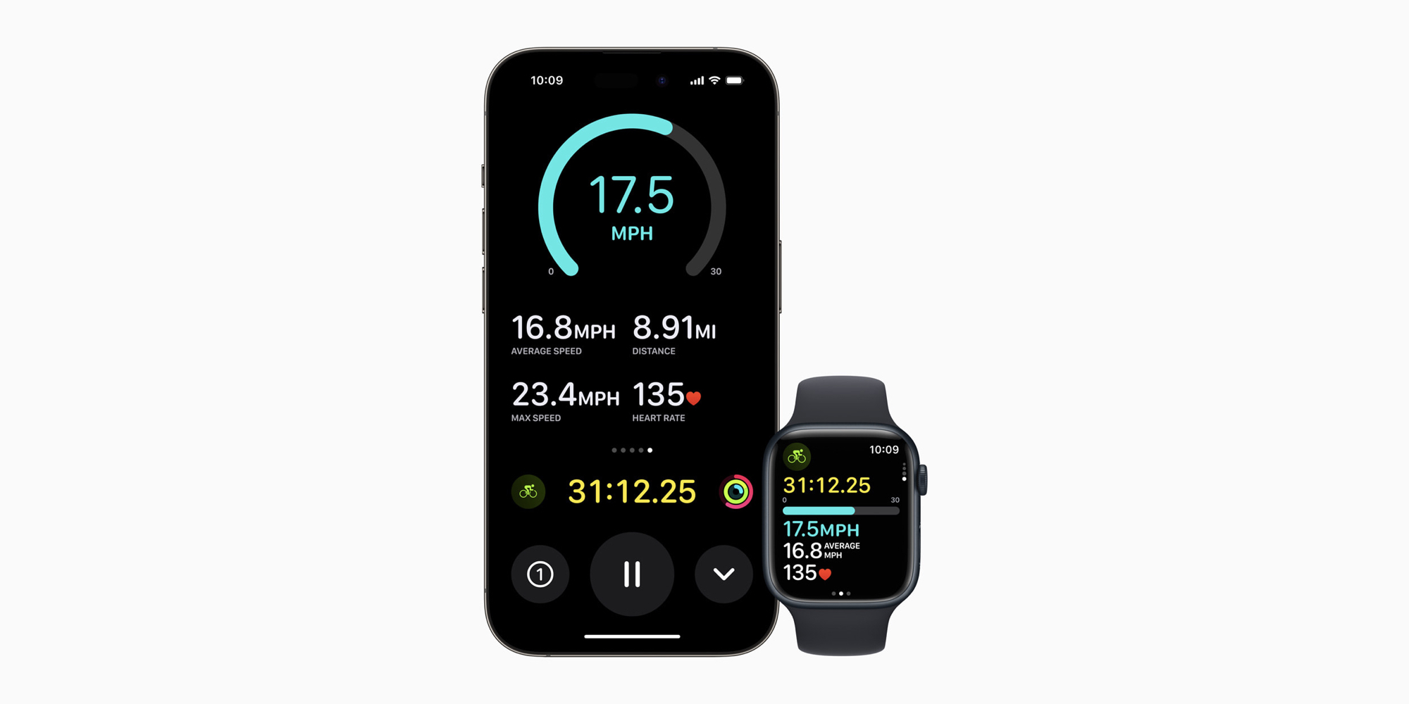 หากเริ่มการปั่นจักรยานบน Apple Watch ที่ใช้ watchOS 10 สามารถเลือกมุมมองแสดงการออกกำลังกายเป็นกิจกรรมสดบน iPhone ได้ ซึ่งก็จะแสดงข้อมูลการออกกำลังกายได้มากขึ้น เช่น โซนอัตราการเต้นหัวใจ ระดับความสูง เส้นทางการแข่งขัน การออกกำลังกายแบบกำหนดเอง และมุมมองความเร็วในการปั่นจักรยานใหม่ ซึ่งข้อมูลทั้งหมดนี้จะปรับให้เข้ากับขนาดจอ iPhone และสามารถติดเข้ากับจักรยานเพื่อให้ดูได้สะดวกและง่ายมากขึ้นระหว่างการปั่น