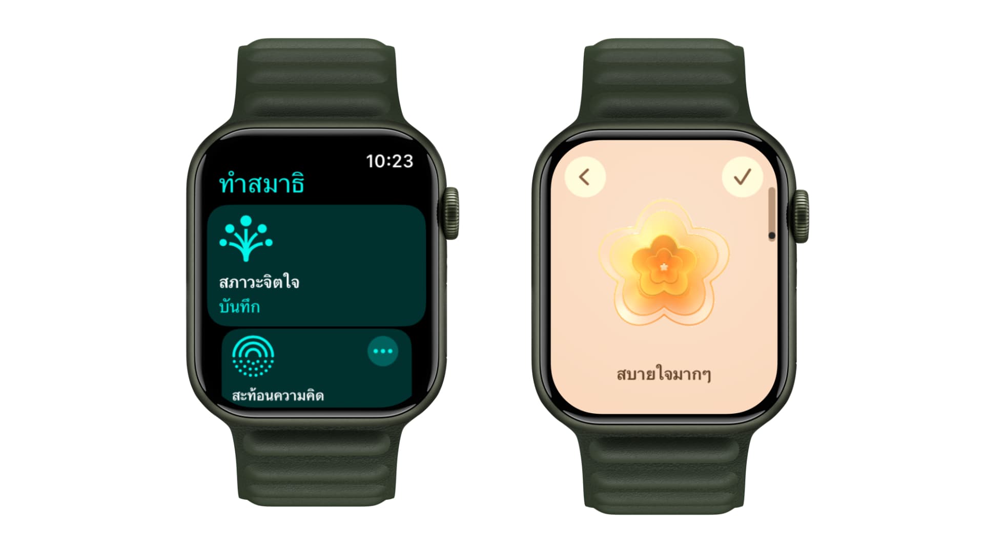 ฟีเจอร์ สภาวะจิตใจ กดเข้าไปเพื่อทำการบันทึก จากนั้นเลื่อนปุ่ม Digital Crown ขึ้นหรือลงเพื่อเลือกหาสภาวะอามรณ์ที่ตรงกับเราในตอนนั้น