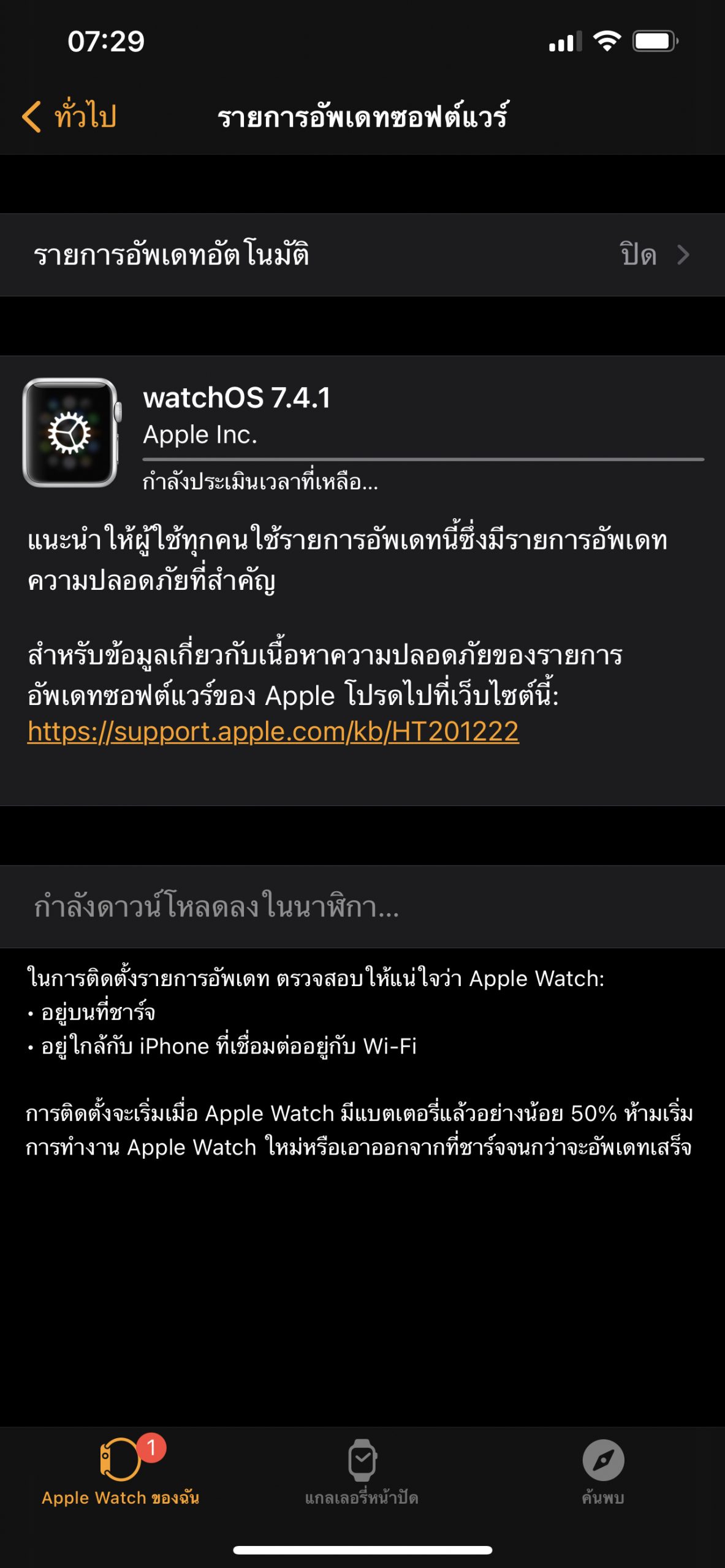 ผู้ใช้ Apple Watch รุ่นรองรับ อัปเดตเป็น watchOS 7.4.1 ได้เลยผ่าน Software Update ใน iPhone ที่เชื่อมต่อ, โดยวาง Apple Watch ไว้บนที่ชาร์จตลอดการอัปเดต และแบตต้องมากกว่า 50%