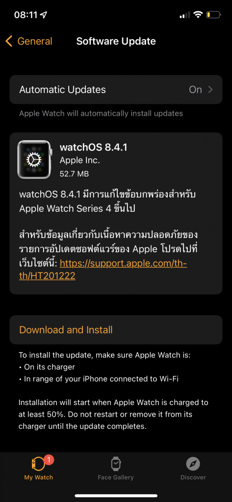 Apple ระบุว่าใน watchOS 8.4.1 ได้อัปเดตแก้ไขปัญหาบน Apple Watch Series 4 หรือใหม่กว่า แนะนำให้ผู้ใช้ Apple Watch Series 4 ขึ้นไปอัปเดตกันได้เลย