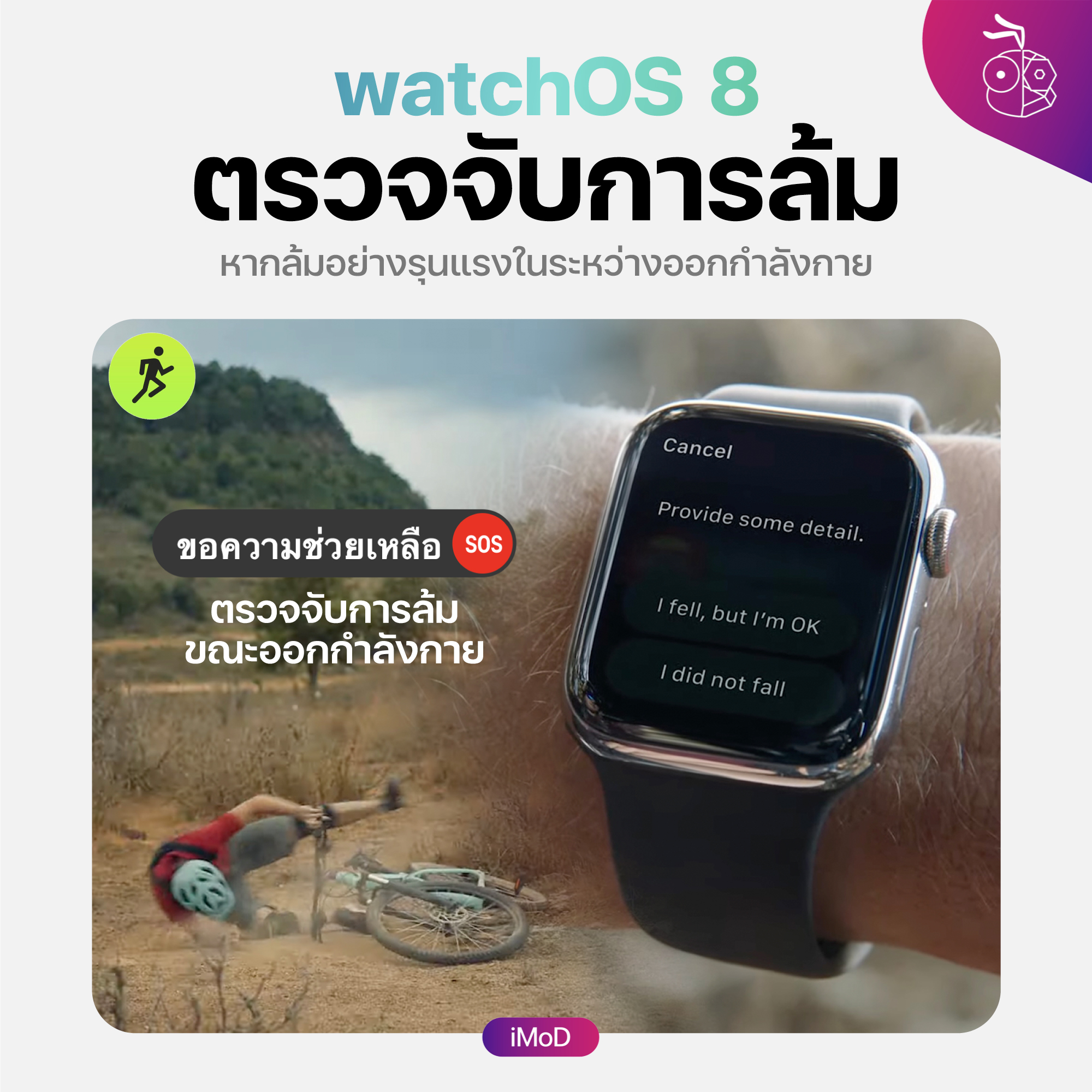 • อัลกอริทึมขั้นสูงสำหรับตรวจจับการล้มในระหว่างออกกำลังกาย และตัวเลือกสำหรับเปิดใช้งานการตรวจจับการล้มเฉพาะในระหว่างออกกำลังกาย (Apple Watch Series 4 ขึ้นไป)