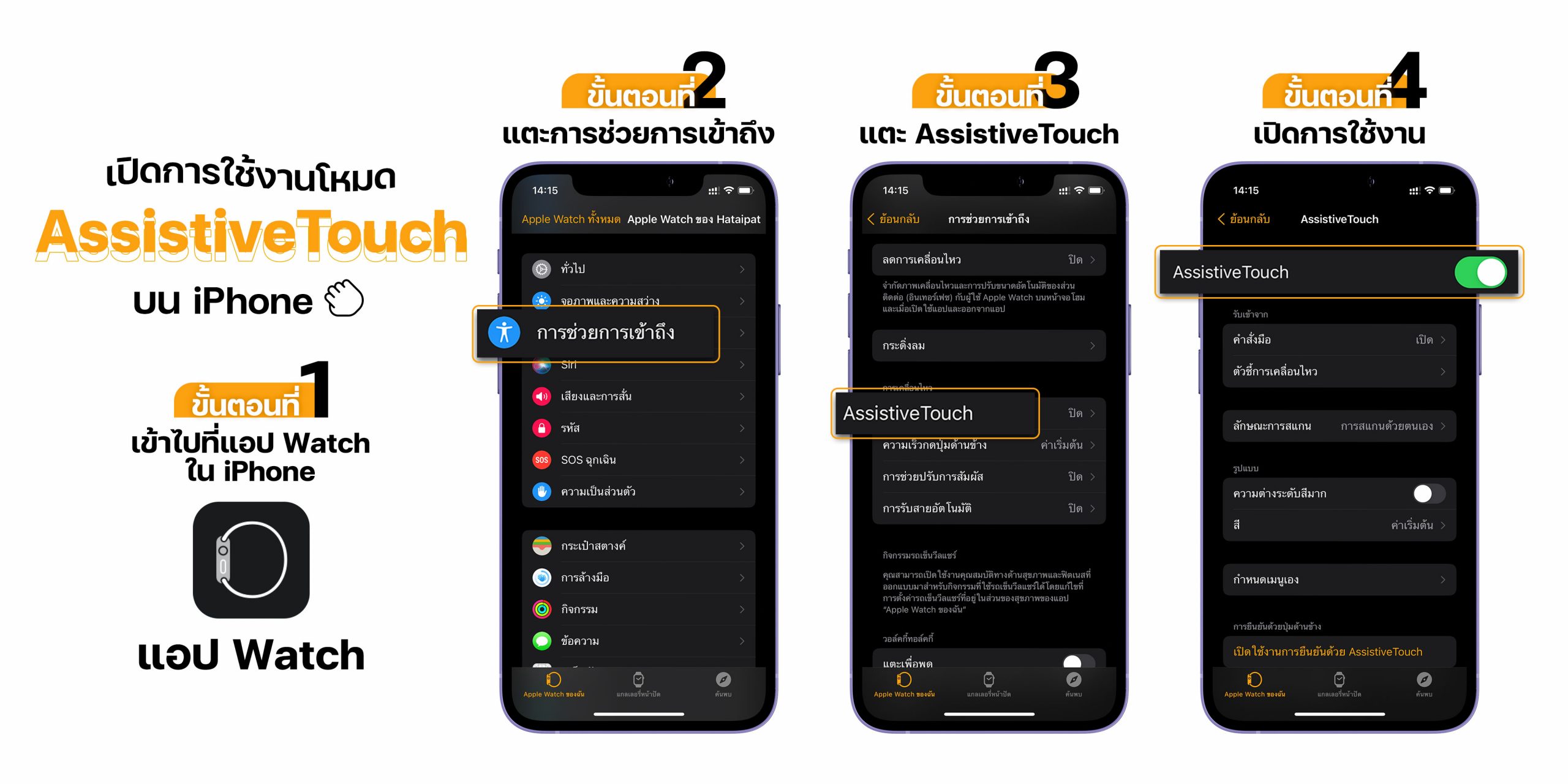 เข้าไปที่แอป Watch > แตะ การช่วยการเข้าถึง > แตะ AssistiveTouch > เปิดการใช้งาน