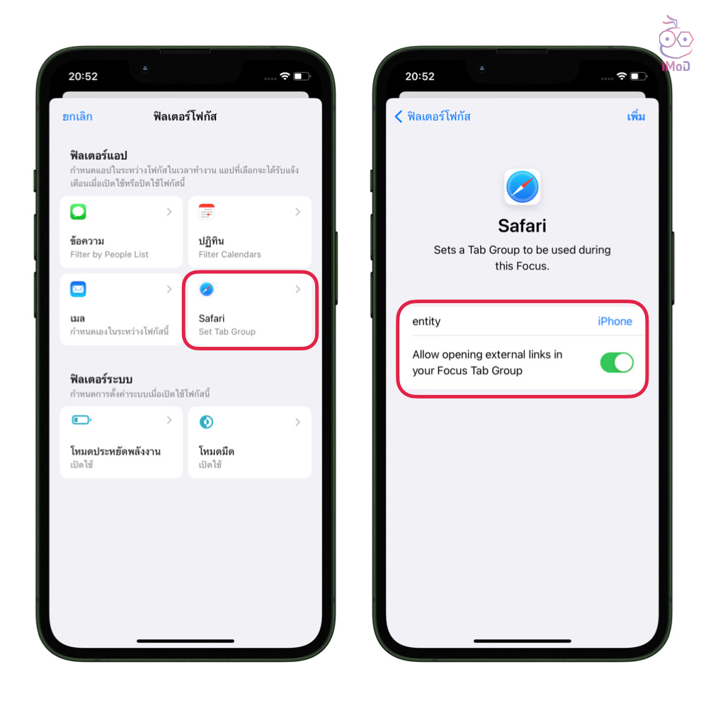 ใน iOS 16 ได้มีการเพิ่มสิ่งใหม่ในฟีเจอร์โฟกัส (Focus) ก็คือ ฟิลเตอร์สำหรับโหมดโฟกัส (Focus Filter) ที่ออกแบบมาให้ผู้ใช้สามารถกรองเนื้อหาภายในแอปได้ สำหรับแอป Safari เราก็สามารถเลือกกลุ่มแถบ (Tab Group) 1 กลุ่ม เพื่อเชื่อมโยงกับโหมดโฟกัส เมื่อเราอยู่ในโหมดโฟกัส เราก็จะสามารถใช้งาน Safari ได้เฉพาะกลุ่มแถบที่เชื่อมโยงเท่านั้น