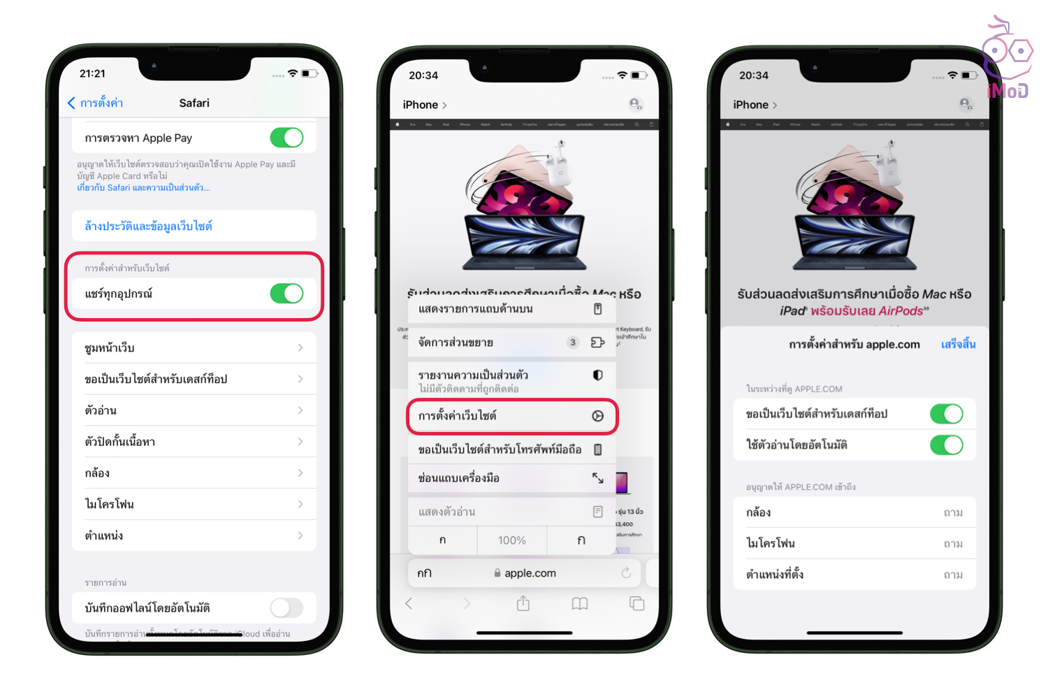 การตั้งค่าเว็บไซต์ของเราจะสามารถซิงค์ระหว่างอุปกรณ์ที่ลงชื่อเข้าใช้ Apple ID เดียวกันได้ เช่น การซูมหน้าเว็บ มุมมองการอ่านอัตโนมัติโดยเราจะต้องเปิดการแชร์การตั้งค่าสำหรับเว็บไซต์ไว้ การแสดงผลเว็บใน Safari บนทุกอุปกรณ์ของเราก็จะใช้การตั้งค่าแบบเดียวกันทั้งหมด