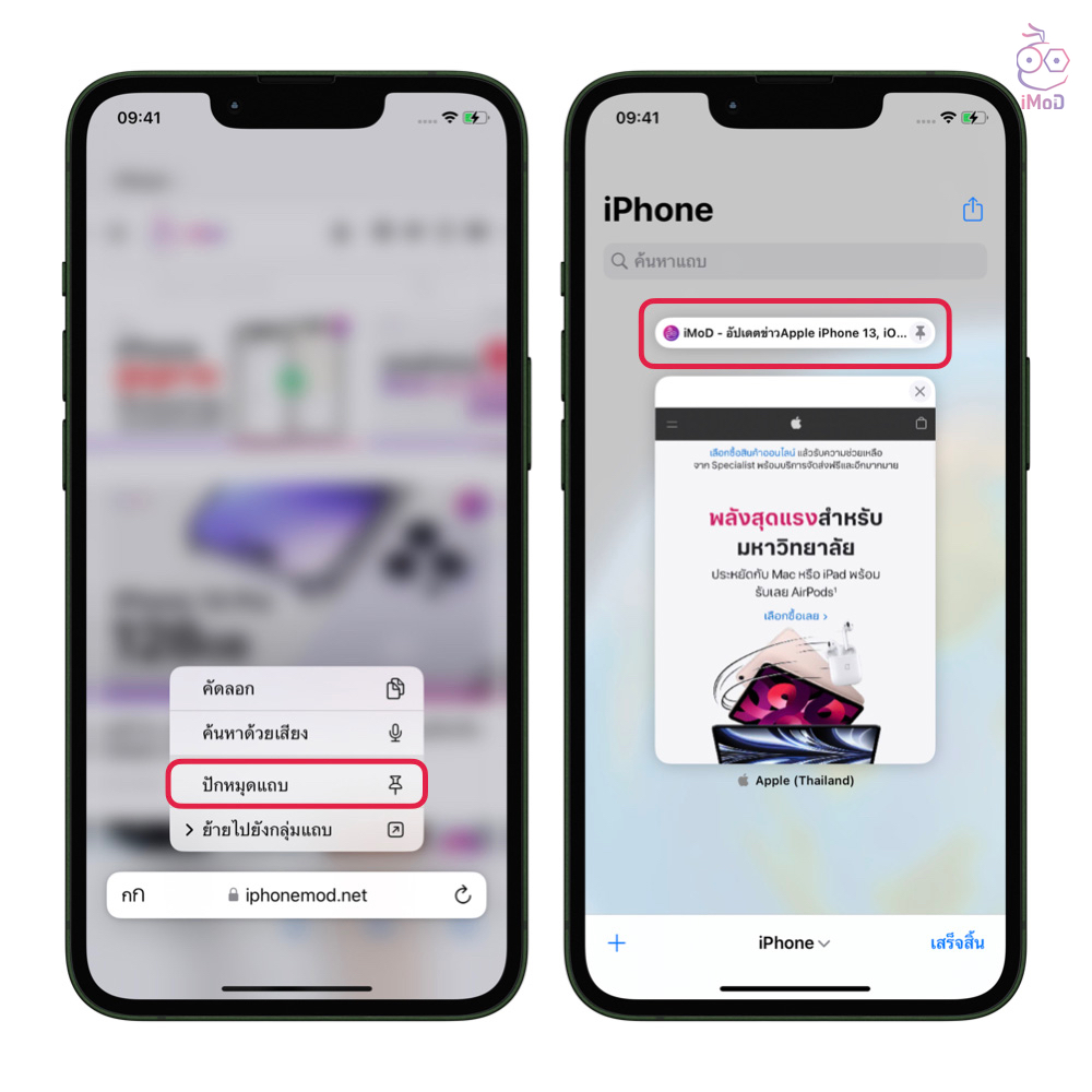 เราสามารถปักหมุดแถบเว็บไซต์ที่เข้าชมบ่อยได้แล้ว ภายในกลุ่มแถบ (Tab Group) โดยแตะที่ส่วน URL ค้างไว้ แล้วเลือก “ปักหมุดแถบ” ได้เลย แถบที่เราปักหมุดก็จะแสดงด้านบนสุดขอหน้ากลุ่มแถบ ทำให้เราเข้าถึงเว็บไซต์ที่เราเข้าชมบ่อยหรือเว็บที่เราชื่นชอบได้ง่ายมากขึ้น