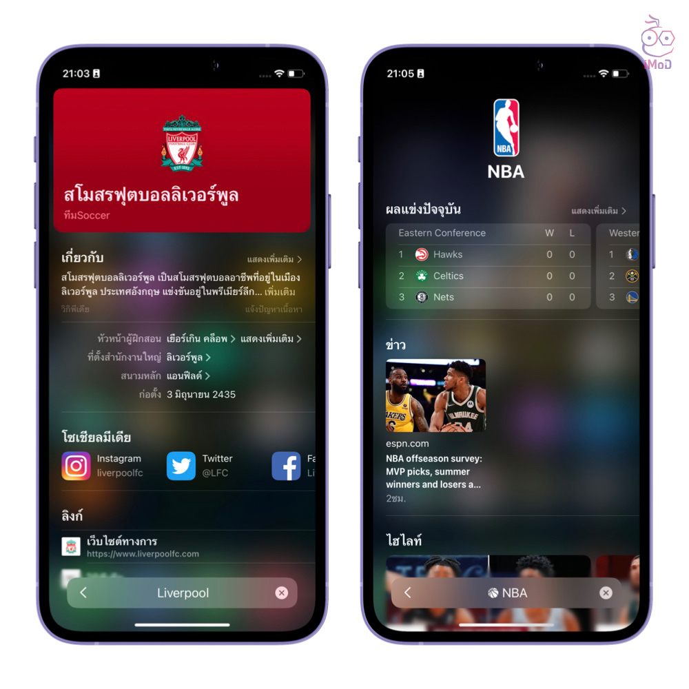 Spotlight Search ใน iOS 16 จะแสดงผลลัพธ์จากการค้นหาที่ละเอียดมากยิ่งขึ้น ในการค้นหาข้อมูลเกี่ยวกับธุรกิจ รวมท้ังลีกการแข่งขันและทีมนักกีฬาต่าง ๆ เราก็จะเห็นข้อมูลอย่างละเอียด