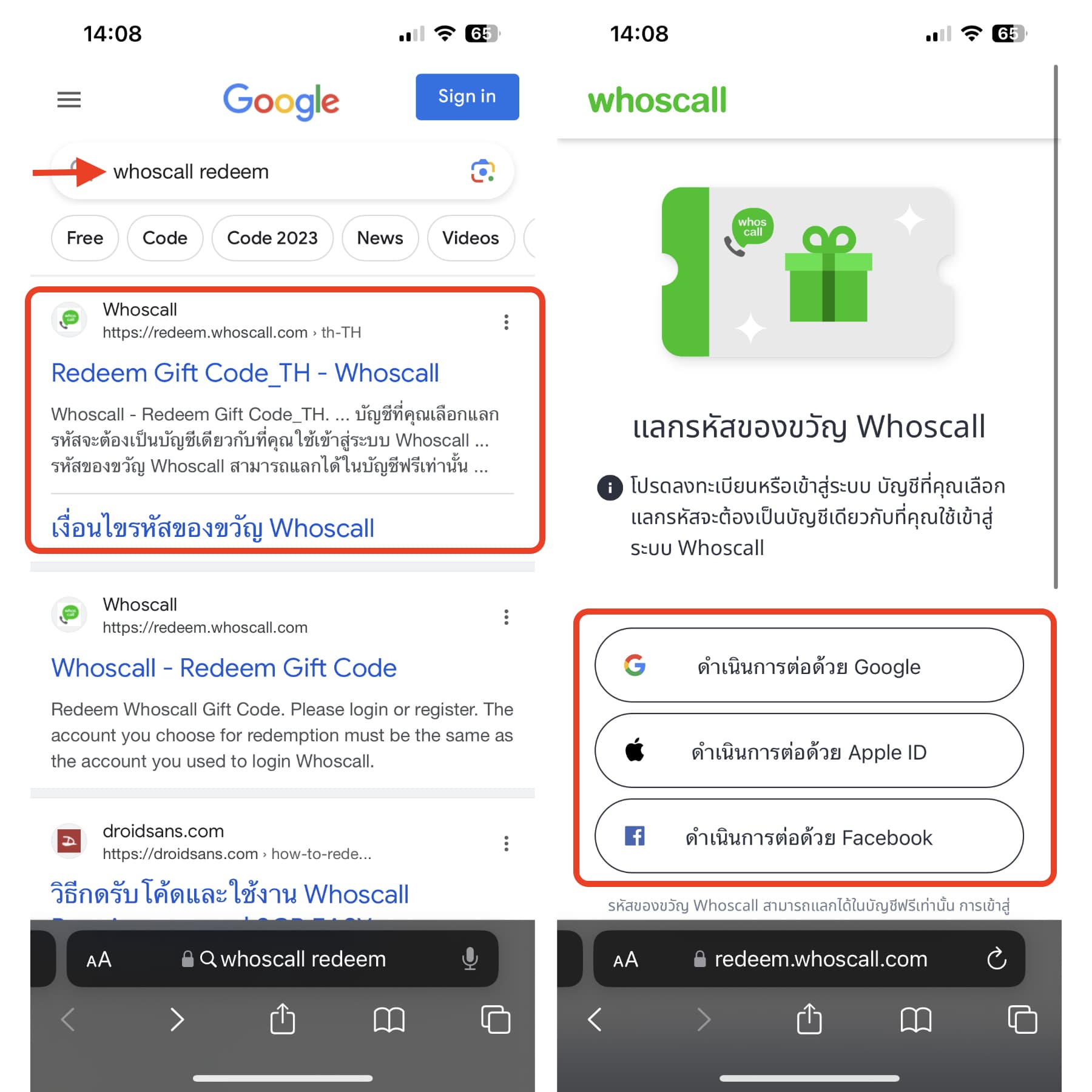 7. เข้าไปที่ Safari พิมพ์ค้นหาคำว่า “whoscall redeem” จากนัเนให้กดที่ลิงก์อันแรกตามรูปด้านล่าง