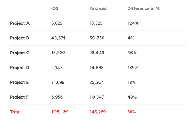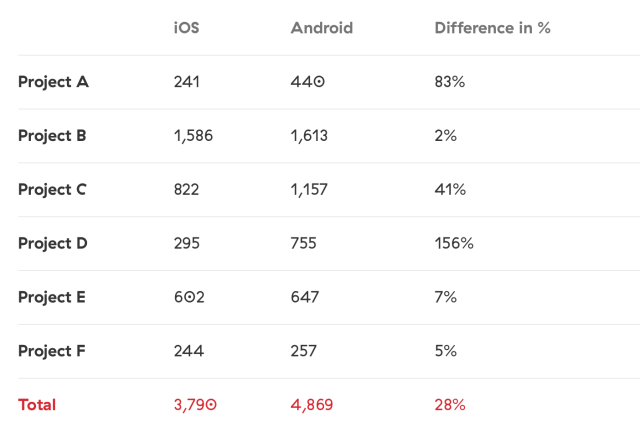 พบว่าแอปพลิเคชันที่มีคุณสมบัติการใช้งานเหมือนกัน การออกแบบเหมือนกัน แต่ทำงานคนละ Platform ในส่วนของ iOS จะมีค่าใช้จ่ายในการพัฒนาที่ต่ำกว่า โดยข้อมูลในตารางเผยให้เห็นถึงค่าเฉลี่ยของ Project พบว่าแอปพลิเคชันของ iOS มีค่าใช้จ่ายในการพัฒนาน้อยกว่าฝั่ง Android ถึง 38% เลยทีเดียว