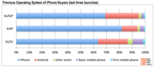 Bryan Clark อ้างอิงข้อมูลจาก CIRP เกี่ยวกับสัดส่วนการเปลี่ยน Smartphone จาก Android มา iOS ว่า ผู้ใช้ส่วนใหญ่เปลี่ยนจาก Android มาเป็น iOS เนื่องจากต้องการความสเถียรภาพ และระบบความปลอดภัยในการใช้งานมากยิ่งขึ้น