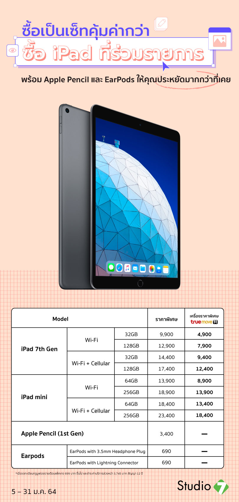- ซื้อ iPad 7th Gen หรือ iPad mini ทุกรุ่น พร้อม Apple Pencil และ EarPods ลดทันที 450 บาท