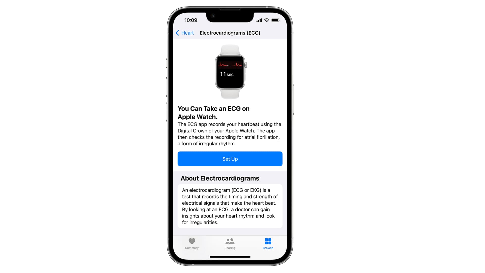 — แอป ECG ใช้เซ็นเซอร์วัดหัวใจแบบไฟฟ้าที่มีอยู่ใน Digital Crown และผลึกบนฝาหลังเพื่อวัด ECG แบบจุดเดียว แล้วจากนั้นแอป ECG ก็จะแสดงผลว่าเป็นจังหวะไซนัส ภาวะหัวใจห้องบนสั่นพลิ้ว ภาวะหัวใจห้องบนสั่นพลิ้วที่มีอัตราการเต้นของหัวใจเร็ว ไม่สามารถสรุปผลได้ หรือการบันทึกไม่ดีพอ แล้วแจ้งให้ผู้ใช้บันทึกอาการต่างๆ เช่น หัวใจเต้นเร็วหรือเต้นแรง เวียนศีรษะ หรือเหนื่อยล้า