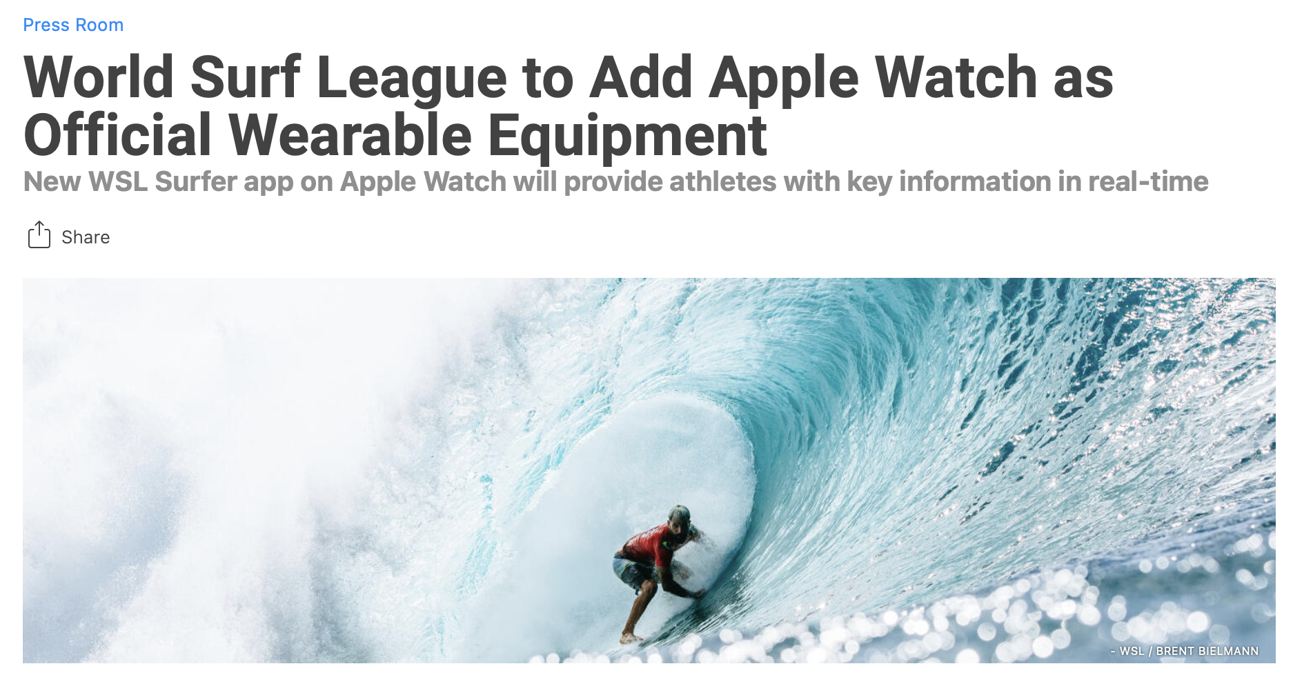 World Surf League (WSL) หรือองค์กรที่กำกับดูแลสำหรับนักเล่นเซิร์ฟมืออาชีพ ได้ประกาศให้ Apple Watch เป็นอุปกรณ์สวมใส่ตอนแข่งขันเซิร์ฟ