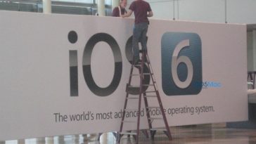 อีกภาพก่อนที่เราจะได้เห็น iOS 6 ตัวจริงในค่ำคืนนี้ เป็นภาพคนงานกำลังติดตั้งป้ายแบนเนอร์ จะเห็นได้ว่า iOS 6 มาพร้อมกับโลโก้ใหม่ที่ต่างจาก iOS 5 ที่ผ่านมาด้วย