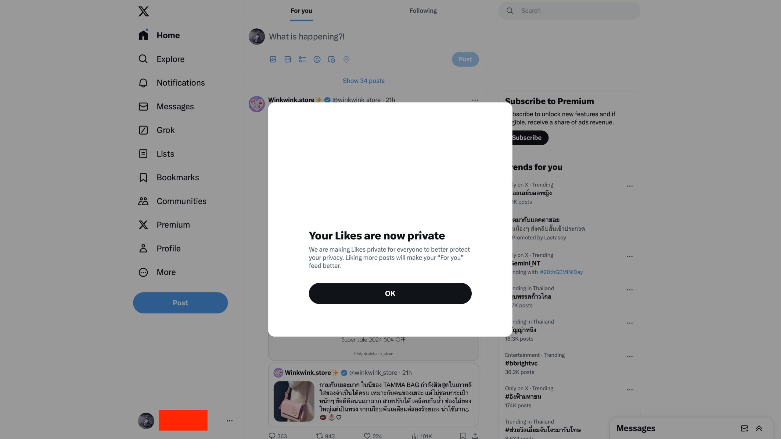 และในวันที่ 12 มิถุนายน 2024 ก็เร่ิมมีการแจ้งเตือนจาก X ว่ามีการเปิดให้ใช้งานฟีเจอร์ใหม่ คือ “ฟีเจอร์ซ่อนไลก์หน้าโปรไฟล์” มาให้กับผู้ใช้งาน X แบบ Premium โดยที่ฟีเจอร์นี้จะซ่อนไลก์หน้าโปรไฟล์ของเราไว้ และผู้ใช้คนอื่น ๆ จะไม่สามารถดูได้อีกด้วย