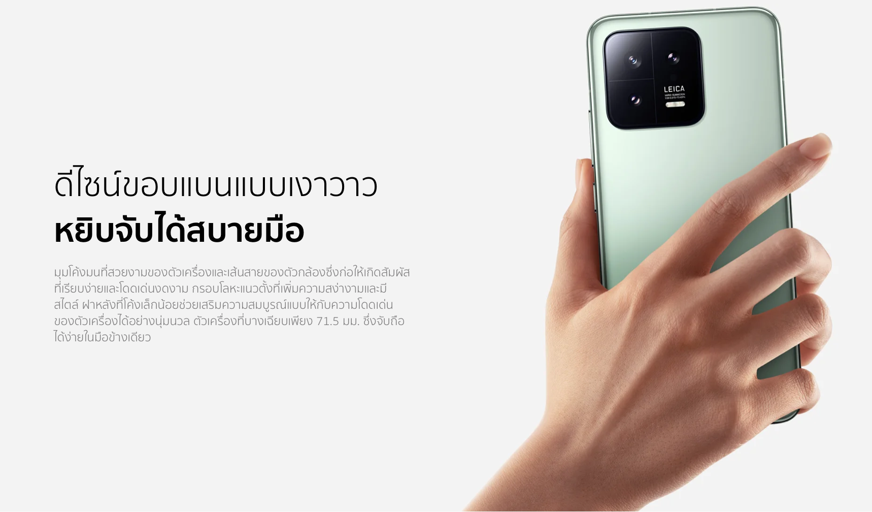 Xiaomi 13 มาพร้อมดีไซน์ขอบแบนแบบเงาวาว โดยตัวเครื่องบางเพียง 71.5 มม. หยิบจับได้ง่ายแม้ใช้มือข้างเดียว