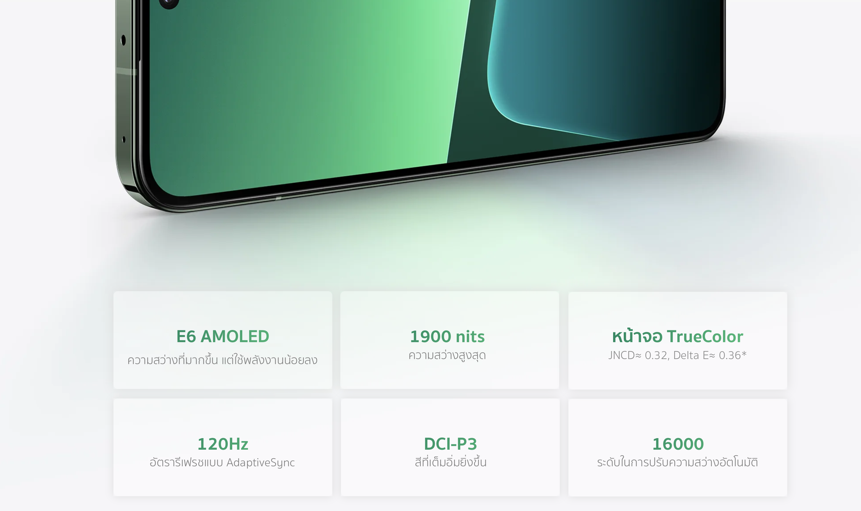 Xiaomi 13 Pro มาพร้อมจอแสดงผล AMOLED WQHD+ ขนาดหน้าจอ 6.73” ความละเอียด 3200×1440 พิกเซล หน้าจอสว่างสูงสุด 1900 nit พร้อม Refresh Rate สูงสุด 120Hz สัมผัสลื่น พร้อมประหยัดพลังงานไปในตัว