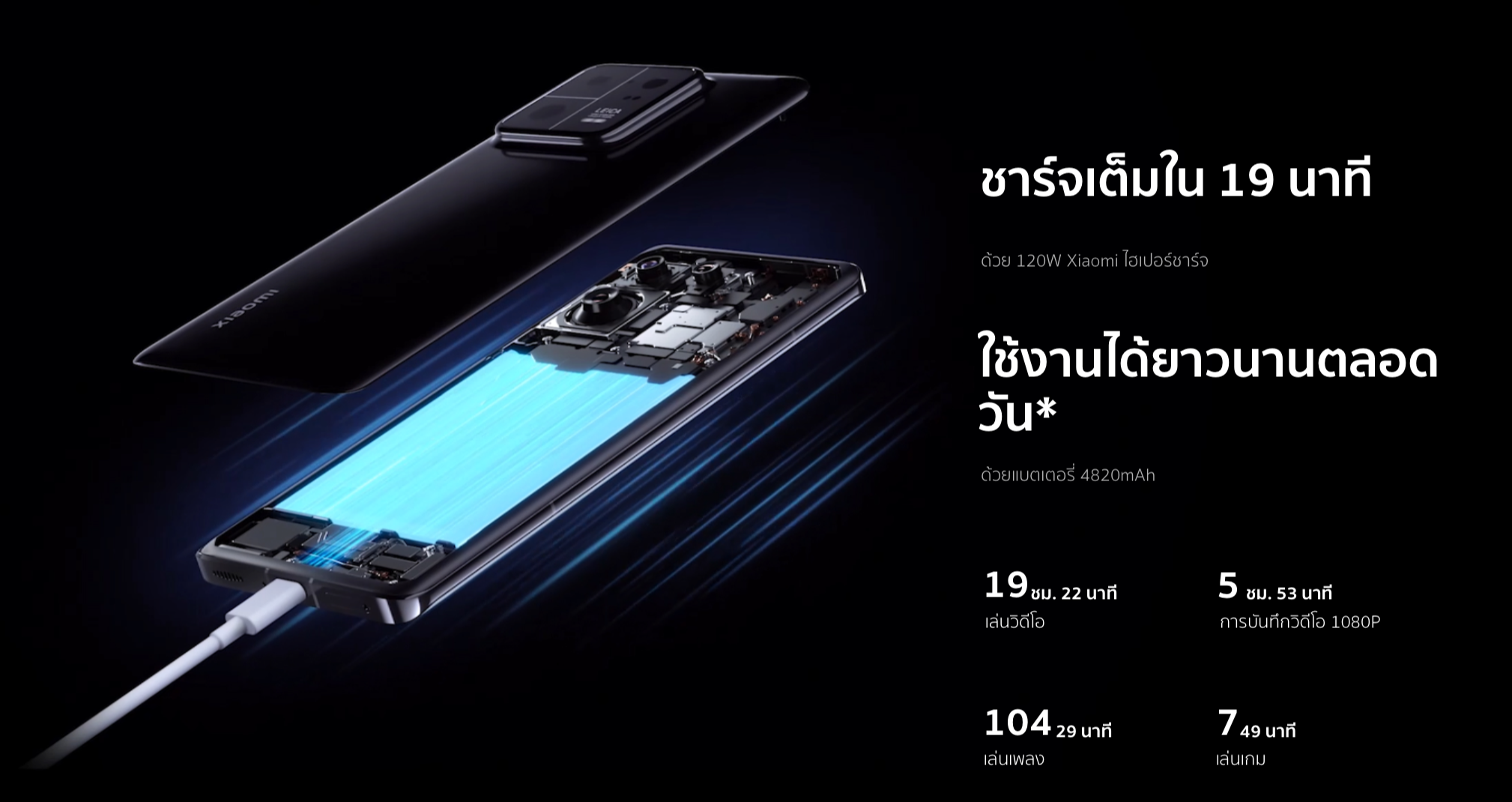 แบตเตอรี่ 4,820mAh ใช้งานได้ทั้งวัน และมีระบบชาร์จเร็วด้วย Xiaomi ไฮเปอร์ชาร์จ 120W ชาร์จเต็ม 100% ใน 19 นาที และภายในก็ยังมี ห้องไอใหญ่พิเศษ 3400 ตร.มม. ที่ช่วยควบคุมและลดอุณหภูมิคอร์ลงได้อย่างมีประสิทธิภาพแม้ในขณะใช้งานหนัก