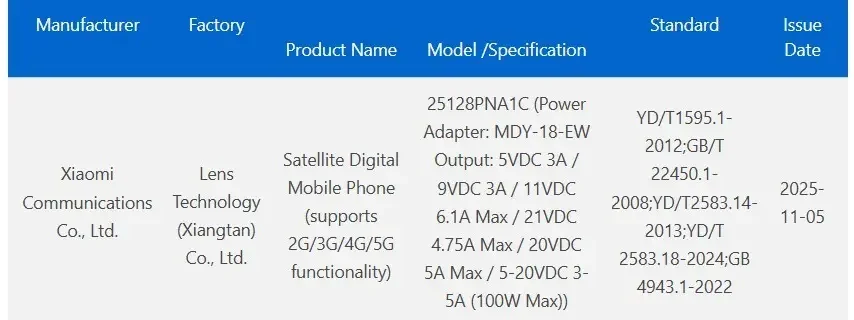 โดยมีสองเวอร์ชัน: หมายเลขรุ่น 2512BPNDAC ไม่มีการเชื่อมต่อดาวเทียม และหมายเลขรุ่น 25128PNA1C ที่มีการเชื่อมต่อดาวเทียม ทั้งสองรุ่นรองรับการชาร์จไวที่ 100W ซึ่งเพิ่มขึ้นจาก 10W จากรุ่น Xiaomi 15 Ultra ที่เปิดตัวในเดือน ก.พ. โดยการเชื่อมต่อดาวเทียมเคยมีข่าวลือเมื่อเดือนที่แล้ว และตอนนี้ถูกยืนยันแล้ว