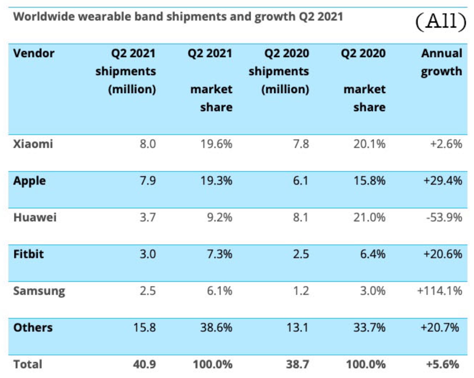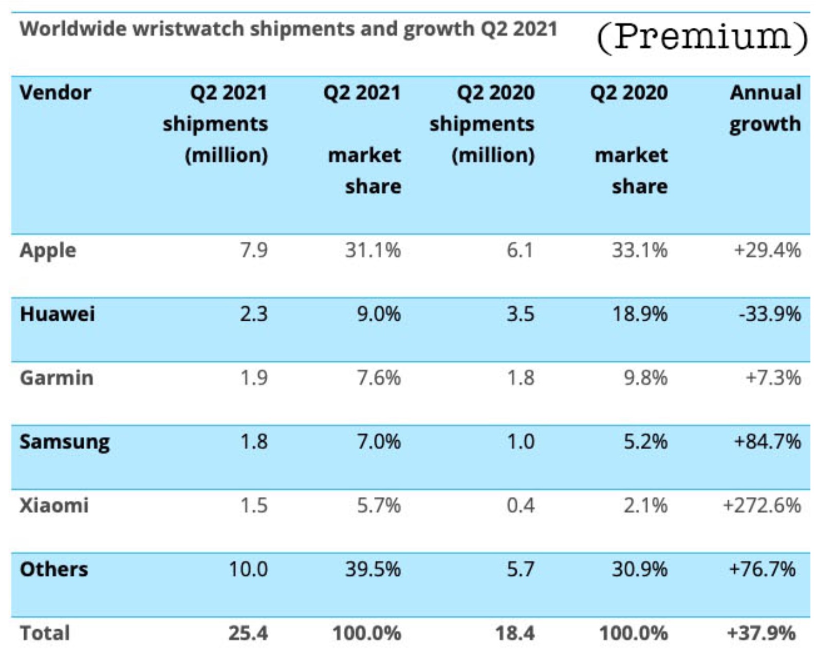 รายงานระบุว่าในไตรมาสดังกล่าว Xiaomi ขาย Smartwatch รวมกันได้ 8 ล้านเครื่อง ตามด้วย Apple ที่ขายได้ 7.9 ล้านเครื่อง และ Huawei ขายไปได้ 3.7 ล้านเครื่อง
