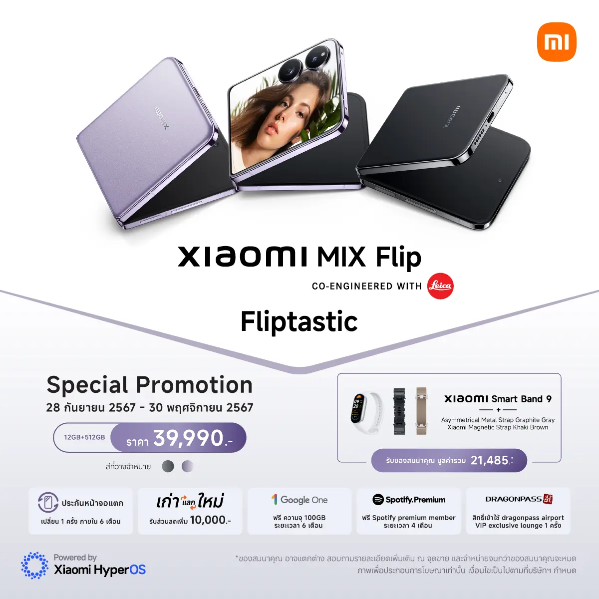 พิเศษ! สำหรับลูกค้าที่ซื้อสมาร์ทโฟน Xiaomi MIX Flip ในระหว่างวันที่ 28 กันยายน – 30 พฤศจิกายน 2567 รับฟรี! Xiaomi Smart Band 9 และ VIP Services ต่างๆ รวมมูลค่าของสมนาคุณ 21,485 บาท