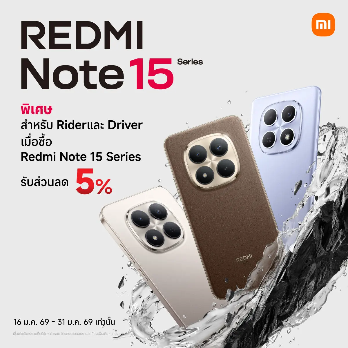 ผ่านการรับรองกันน้ำ 24 ชม. ที่ความลึก 2 เมตร โดยมอบส่วนลดทันที 5% เมื่อซื้อ REDMI Note 15 Series ทุกรุ่นตั้งแต่วันนี้ – 31 มกราคม 2569 ที่ Xiaomi Store หรือที่เว็บไซต์ www.mi.com/th15 เพียงกดรับโค้ดส่วนลดในแอปพลิเคชันของผู้ให้บริการของตนเอง แล้วมาแสดงหน้าร้านหรือกรอกลงในเว็บไซต์ก่อนขั้นตอนการชำระเงิน