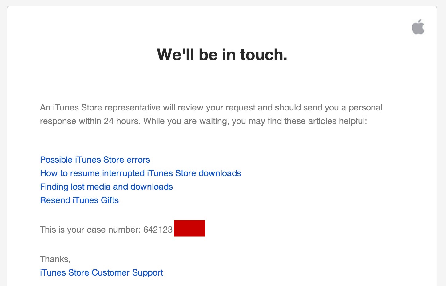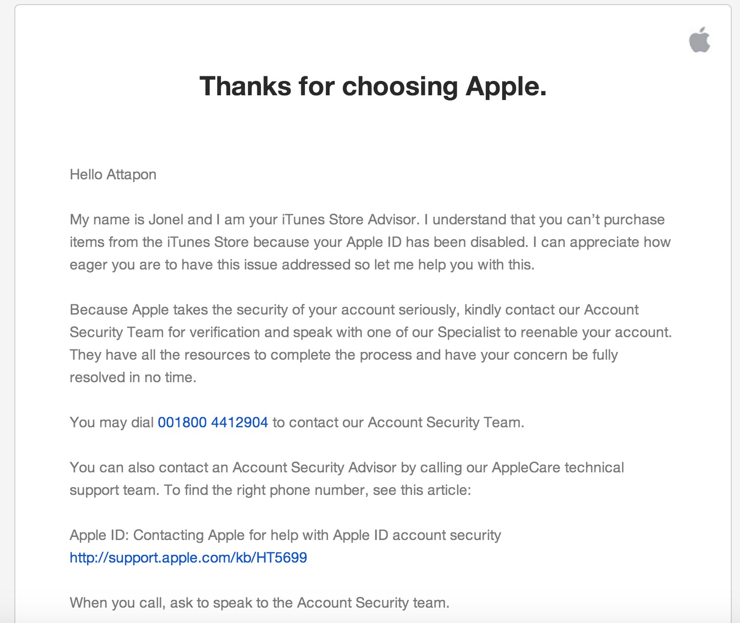 ผมเริ่มแก้ปัญหาโดยเข้าไปเว็บ Support ของทาง Apple แล้วก็ส่งเรื่องไปผ่านระบบหน้าเว็บ (ส่วนนี้เล่าให้หังก่อน แต่ทางแก้ที่ดีสุดคือ โทรหา Apple Support ตามที่บอกไว้ด้านล่าง) สุดท้ายหลังจากส่งเรื่องเสร็จก็ได้อีเมลตอบกลับแบบออโต้มาแจ้ง ดังนี้