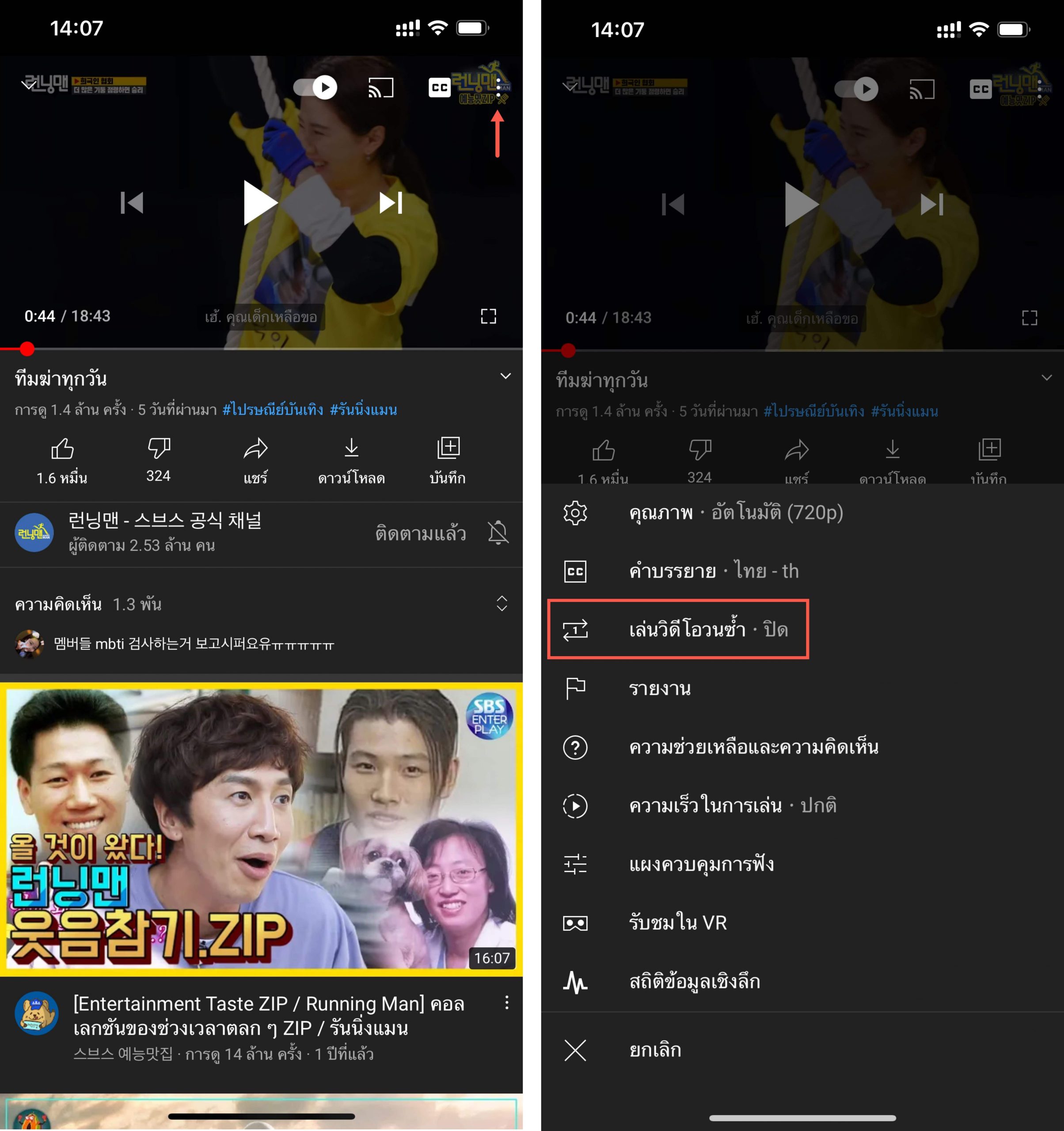 วิธีเปิดใช้งานฟีเจอร์ Loop Video ในแอป YouTube ทำได้โดย แตะ “…” ที่มุมบนของวิดีโอ > แตะ “เล่นวิดีโอวนซ้ำ” (Loop Video) ให้เป็นสถานะ “เปิด” (On)
