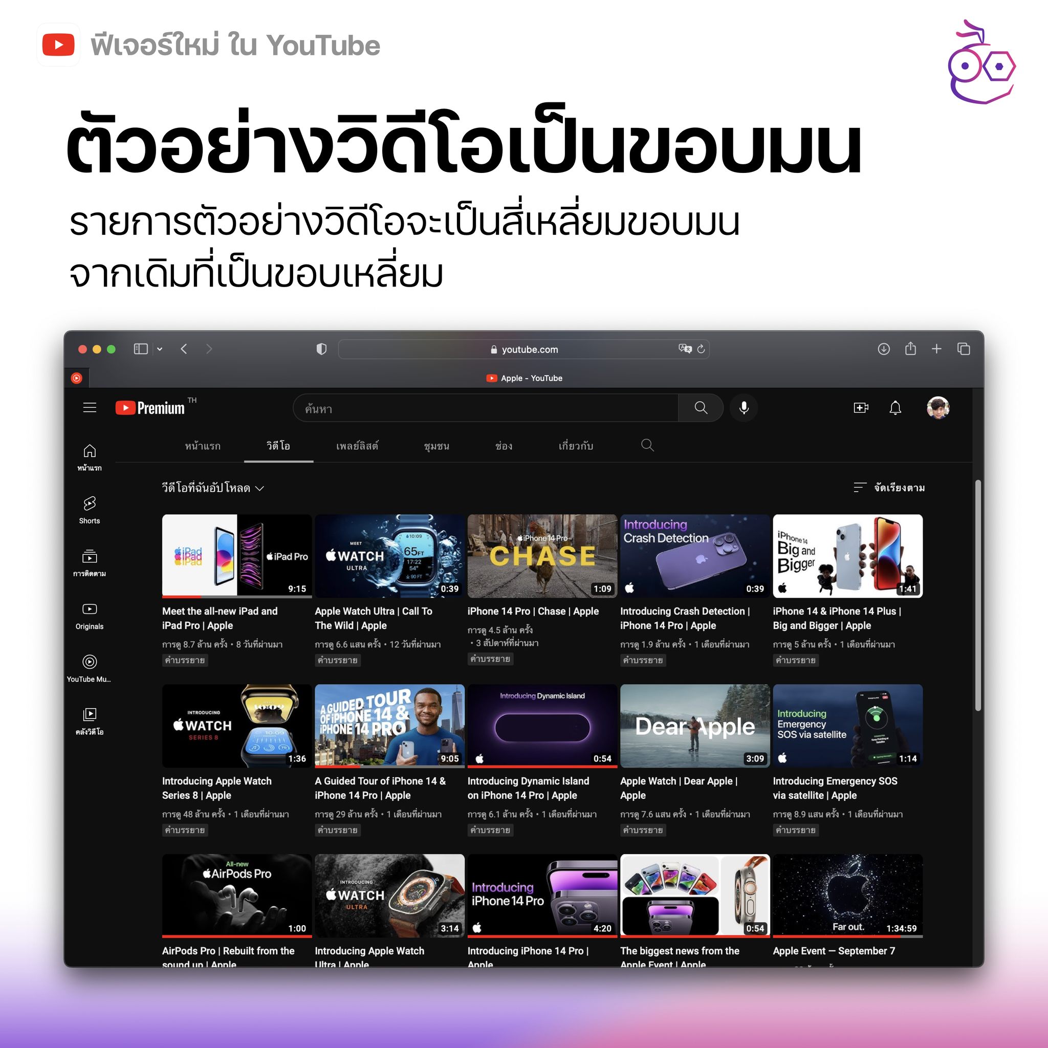 รายการตัวอย่างวีดีโอในหน้าจอหลักของ Youtube จากเดิมที่เป็นสีเหลี่ยมขอบเหลี่ยม ได้ปรับใหม่มาเป็นสีเหลี่ยมขอบมน