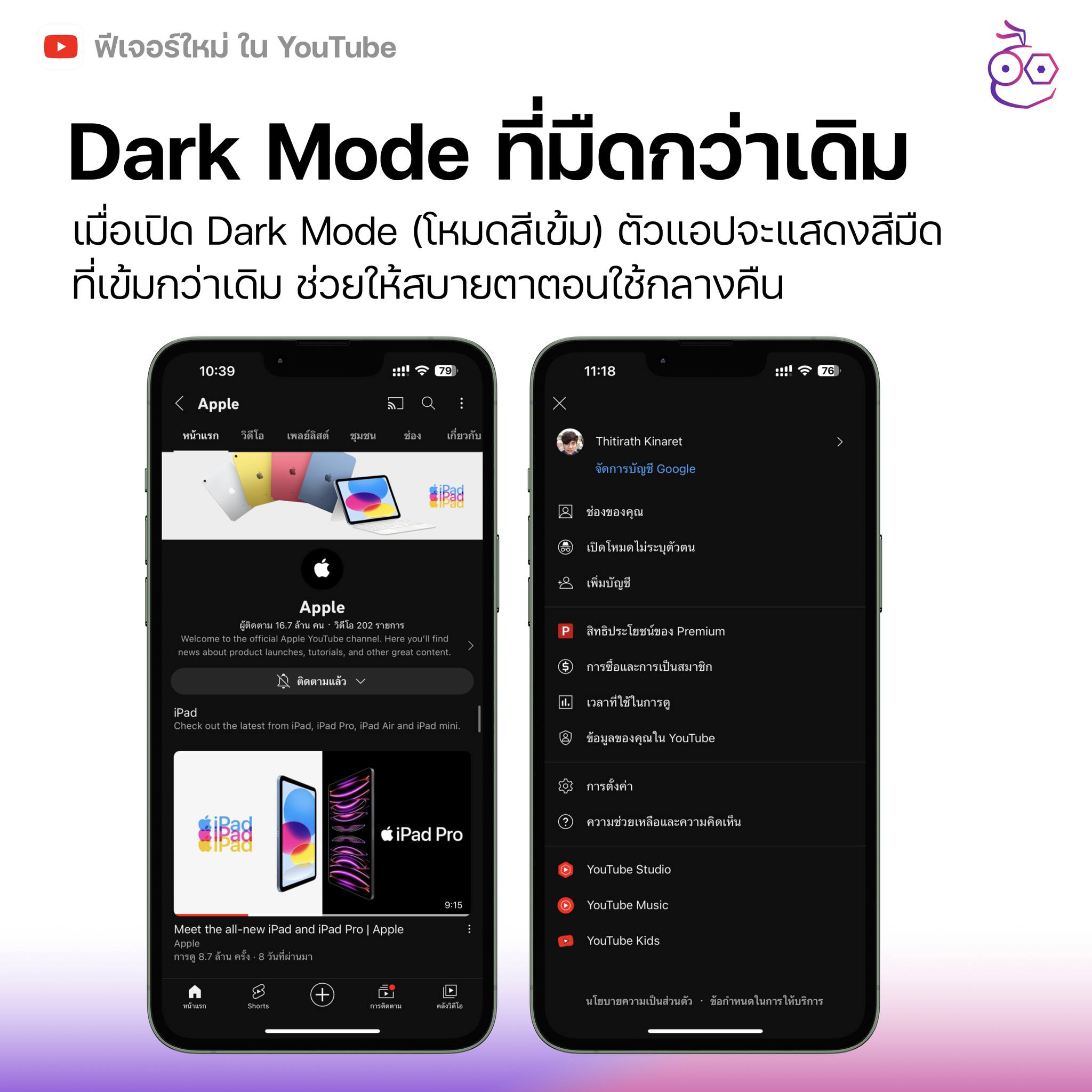 Dark Mode หรือโหมดสีเข้ม อัปเดตใหม่ แสดงสีมืดที่เข้มกว่าเดิม ช่วยให้สามารถใช้งานได้สบายตาเมื่อใช้ตอนกลางคืน หรือ สถานที่ที่มีแสงน้อย