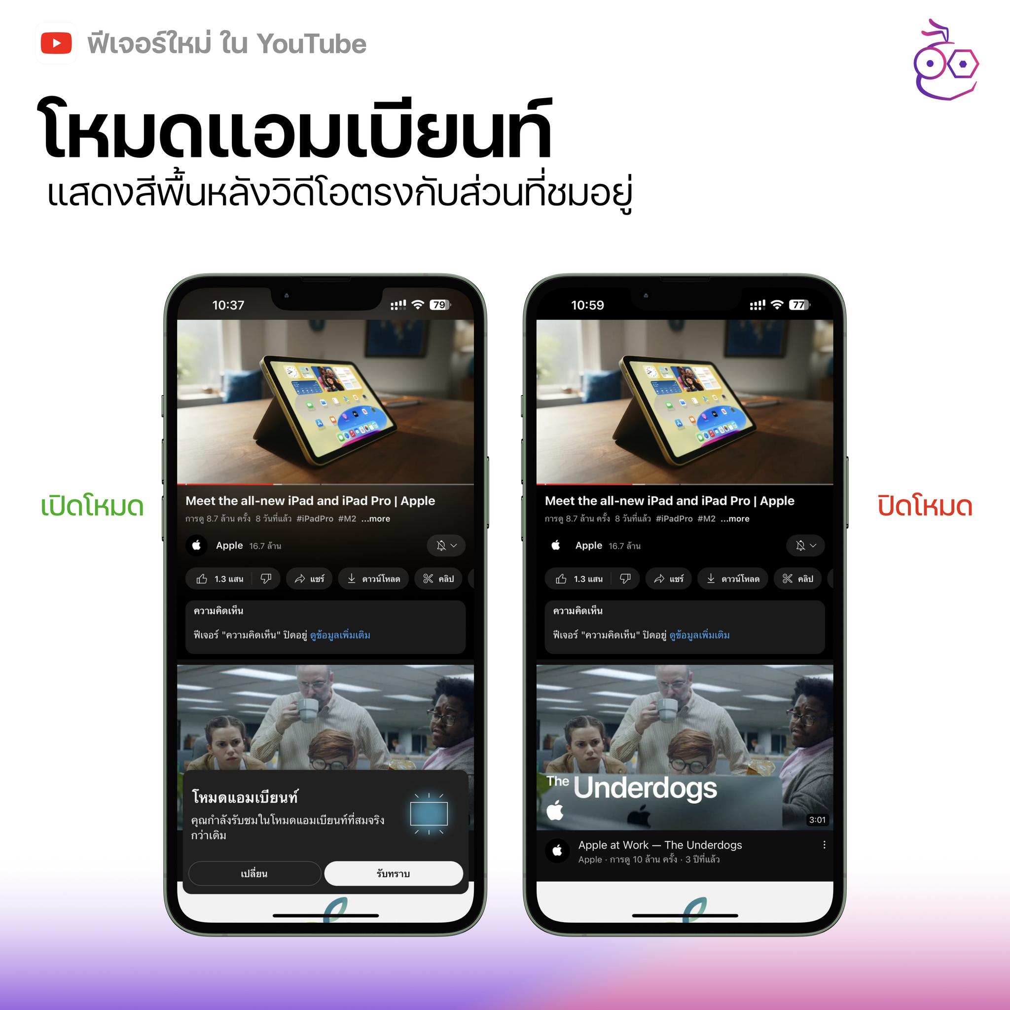 เมื่อเปิดใช้งานโหมดแอมเบียนส์ จะแสดงสีของพื้นหลังวีดีโอตรงกับส่วนที่เรากำลังรับชมอยู่ สามารถเข้าไป เปิด-ปิด ฟีเจอร์นี้ได้ที่ฟันเฟืองด้านบนขวา