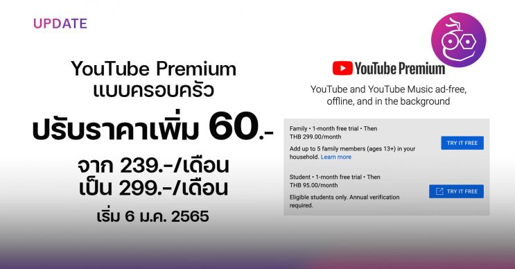 YouTube ปรับขึ้นราคา YouTube Premium แผนครอบครัว (Family) แพงขึ้น 60 บาท จากราคา 239 เป็น 299 บาท/เดือน มีผลตั้งแต่วันที่ 6 มกราคม 2565 เป็นต้นไป