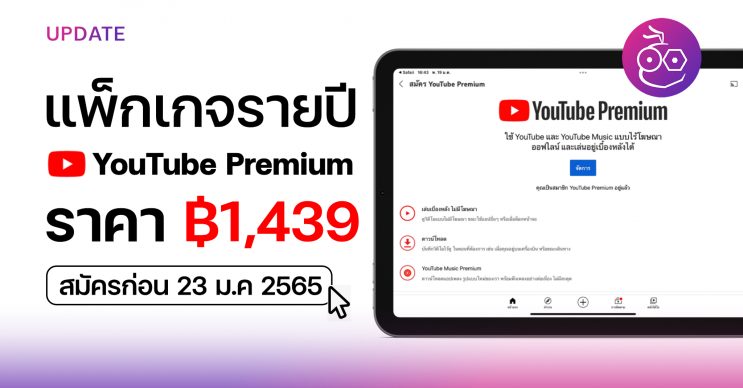YouTube Premium เพิ่มแพ็กเกจรายปี ราคา 1,439 บาท/ปี ตกเดือนละ 119.91 บาท เป็นราคาโปรโมชันถึงวันที่ 23 ม.ค. 65 รีบสมัครก่อนหมดเวลา