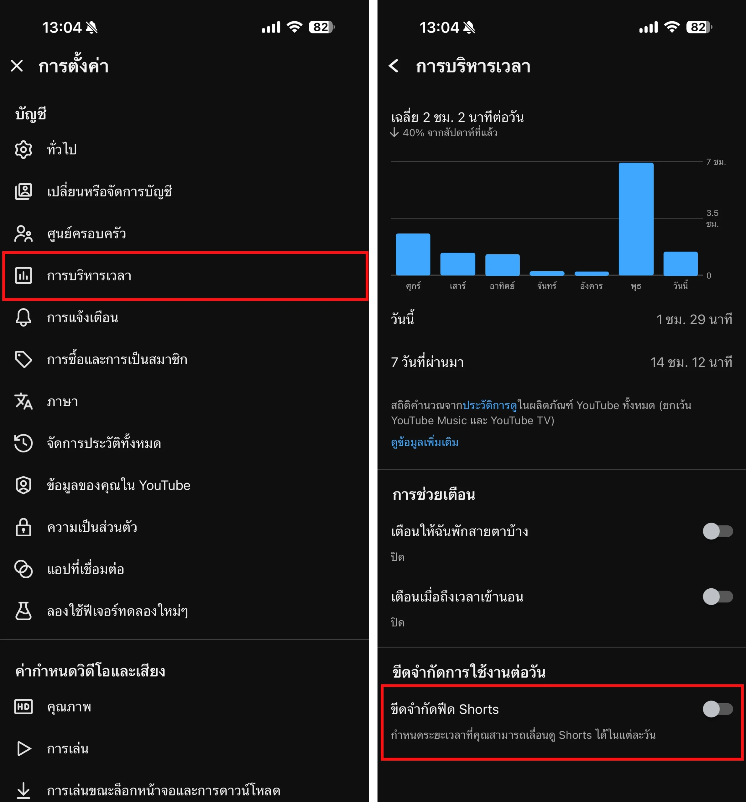 เปิดแอป YouTube > ไปที่การตั้งค่า > การบริหารเวลา > เลื่อนเปิด ขีดจำกัดฟีด Shorts > เลือกเป็น 0 นาที
