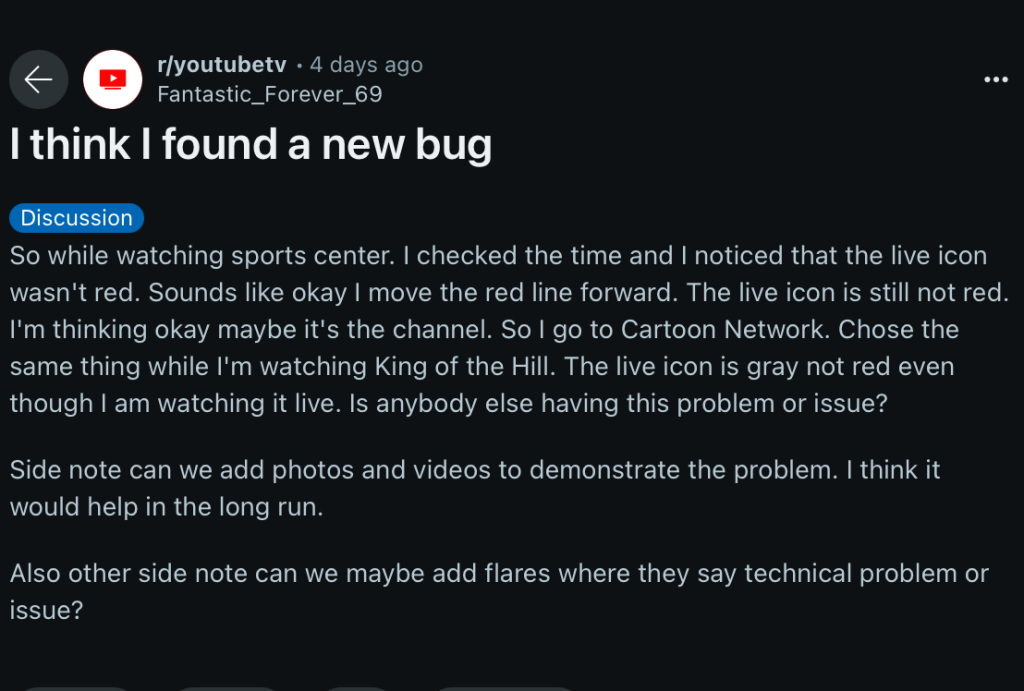 ล่าสุดมีผู้ใช้ YouTube TV บางรายใน Reddit ได้ออกมาพูดถึงข้อบกพร่องในการใช้งาน YouTube TV ว่า ภายในแอปแสดงเนื้อหาในลักษณะที่ดูเหมือนว่าไม่ได้ดูสดอยู่ ถึงแม้ว่าจะเป็น YouTube TV เเละไม่มีไอคอน “ถ่ายทอดสด” สีแดงเด้งออกมา กับกลายเป็น ไอคอนสีเทาแทน
