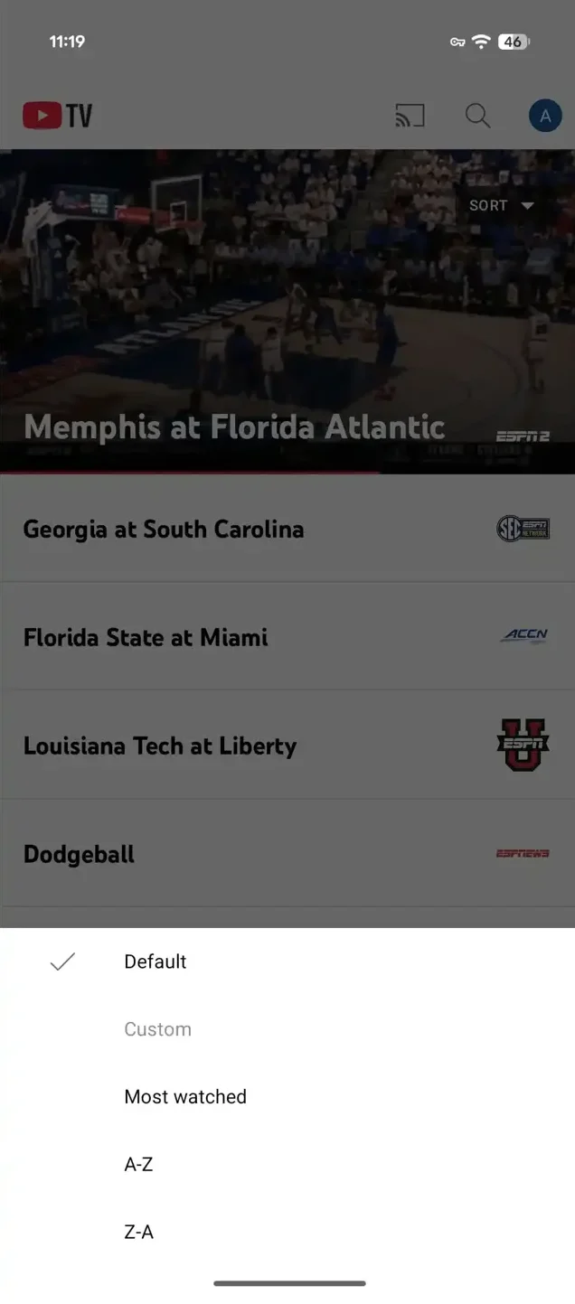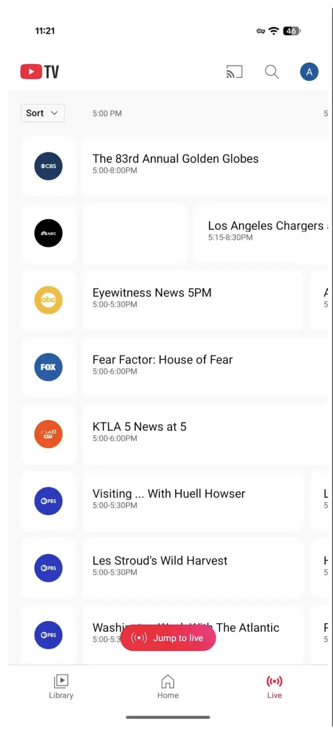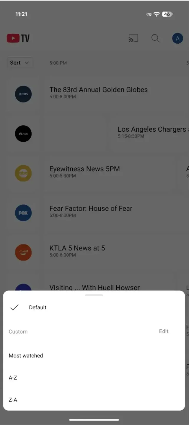 YouTube TV จะแสดงข้อมูลระยะเวลาของรายการและเวลาที่เหลืออยู่ ผู้ใช้สามารถค้นหาเมนู “Sort” ได้ที่มุมซ้ายบนของหน้าจอ หากต้องการดูตัวอย่างช่อง เพียงแค่กดค้างที่รายการ ซึ่งจะแสดงคำอธิบายพร้อมตัวเลือกให้คุณสามารถ: