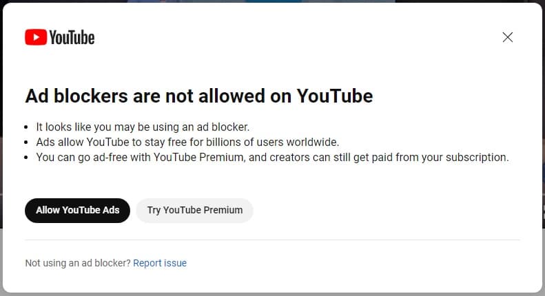 ผู้ใช้ Reddit รายงานว่าตอนเข้าดูวิดีโอในเว็บ YouTube ก็พบหน้าต่างแจ้งเตือนข้อความว่า “ตัวบล็อคโฆษณาไม่อนุญาตบน YouTube” ขึ้นมา พร้อมอธิบายว่า ระบบตรวจจับว่าผู้ใช้มีการติดตั้ง Ad Blocker