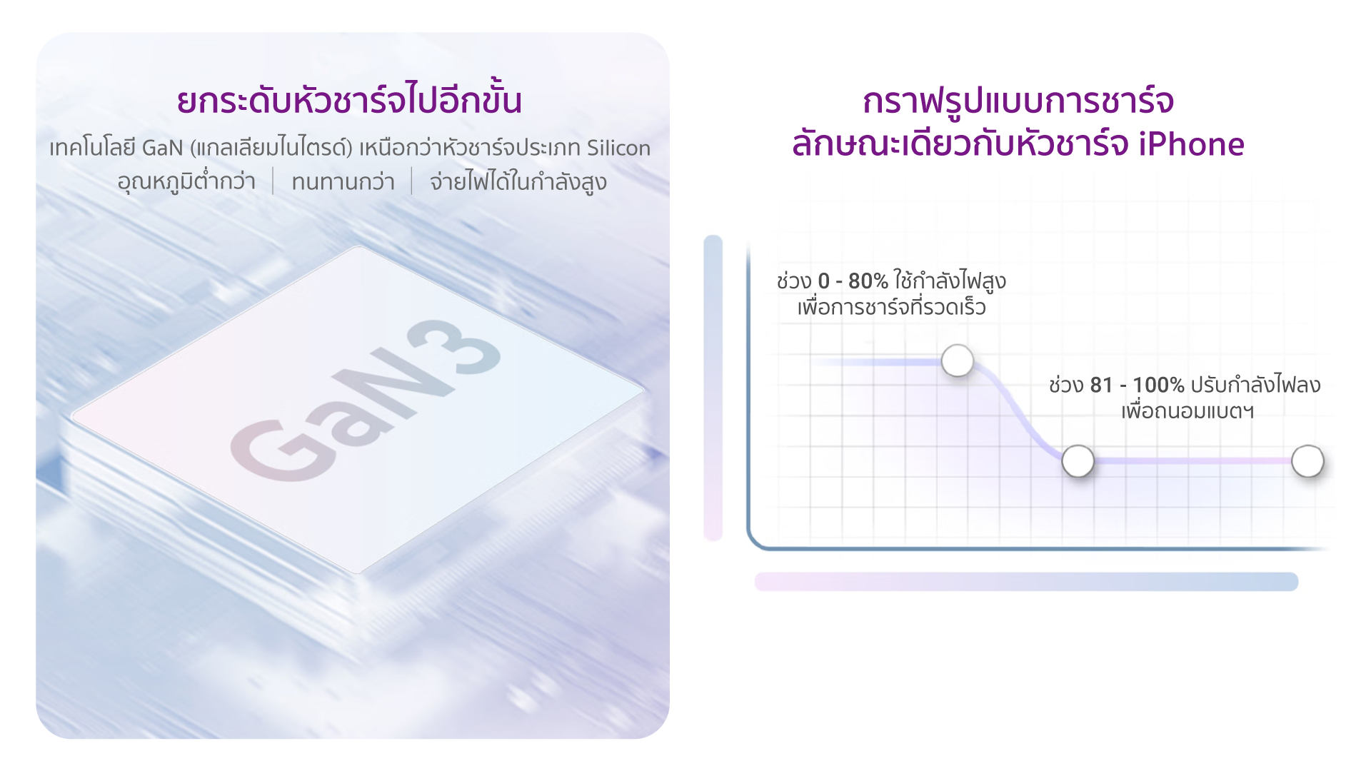 และยกระดับหัวชาร์จไปอีกขั้นด้วยเทคโนโลยี Gallium Nitride หรือ GaN ใหม่ล่าสุดรุ่นที่ 3