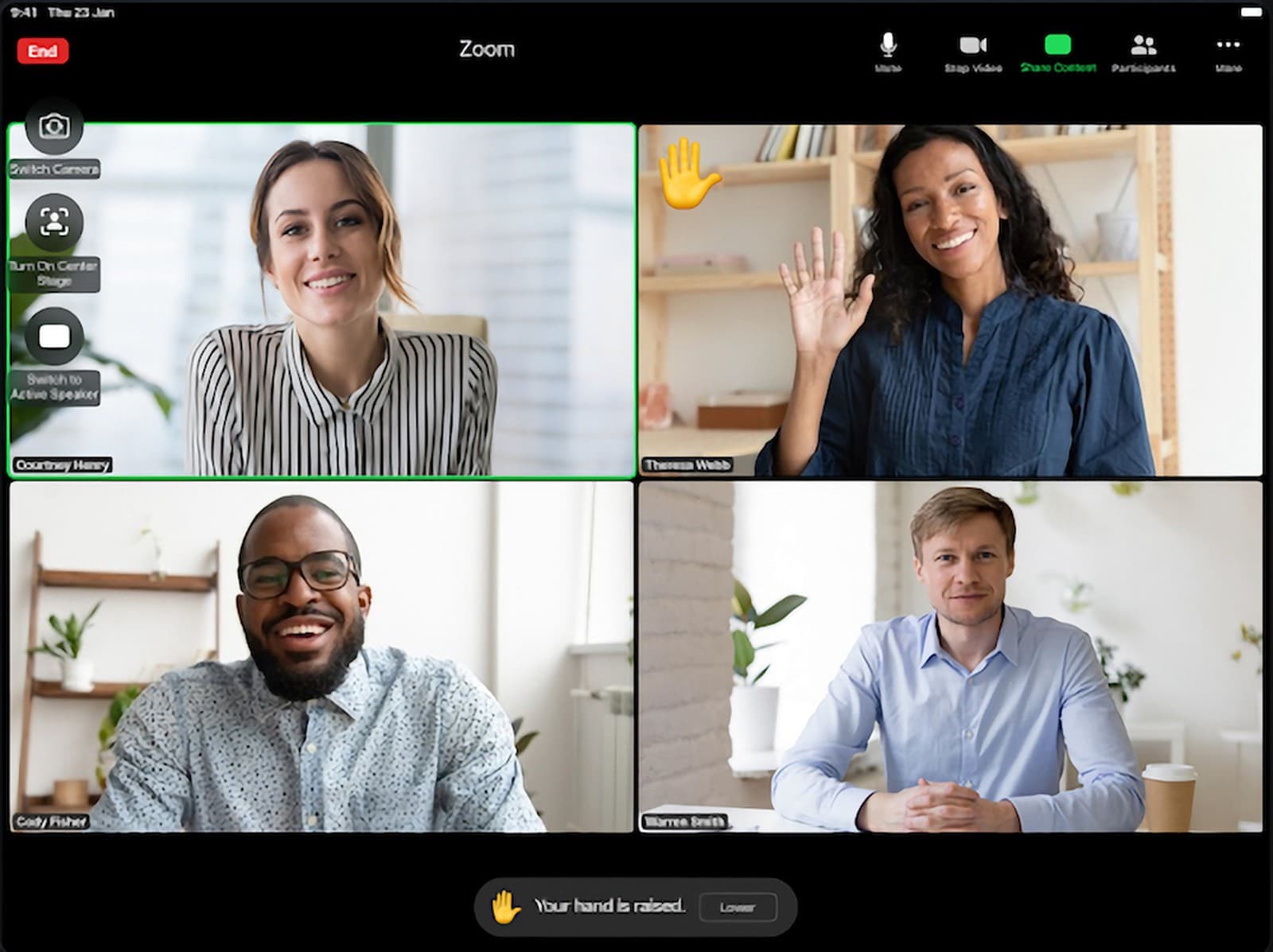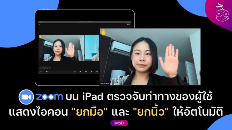 แอป Zoom บน iPad เวอร์ชันล่าสุด มีฟีเจอร์ตรวจจับท่าทางของผู้ใช้ ที่จะตอบสนองเมื่อผู้ใช้ “ยกมือ” หรือ “ยกนิ้ว” ระบบก็จะแสดงไอคอนยกมือหรือยกนิ้วโป้งให้ขึ้นที่หน้าจอผู้ประชุมโดยอัตโนมัติ