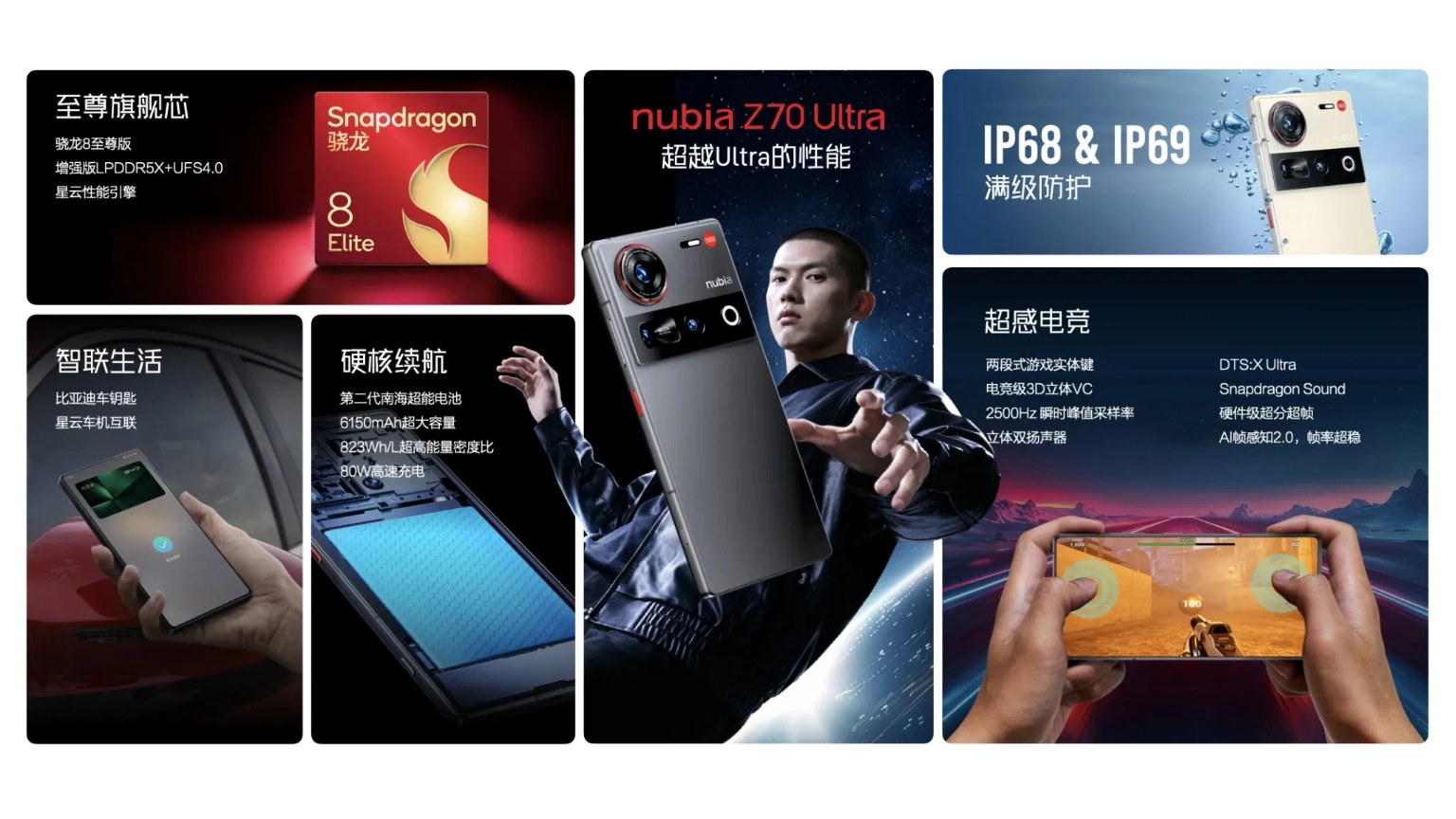 Z70 Ultra ใช้ระบบ Nebula AIOS บนพื้นฐาน Android 15 ซึ่งมาพร้อมกับฟีเจอร์ AI มากมาย ตัวเครื่องยังมาพร้อมกับระดับการกันน้ำกันฝุ่น IP69 ระบบสื่อสารดาวเทียมสองทาง และแบตเตอรี่ซิลิคอนคาร์บอน 6,150 mAh รองรับชาร์จเร็ว 80W